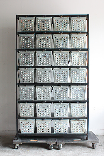 もともとはアメリカの学校の体育館やジムなどで、個人の荷物を収納するために使用されていたもの。各バスケットは南京錠で施錠できる仕様になっています。